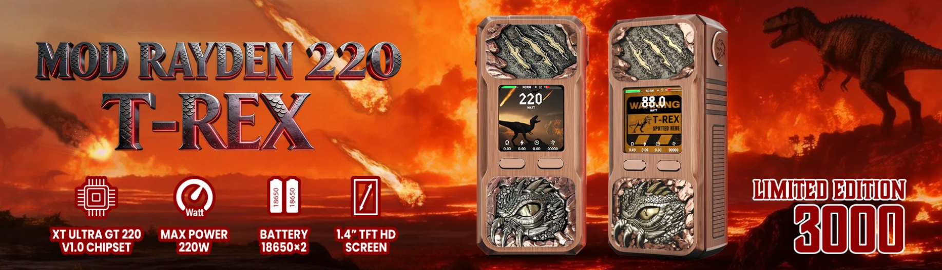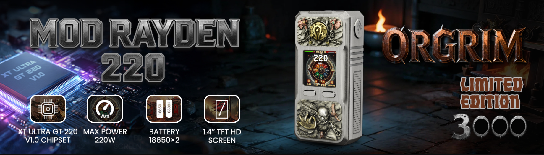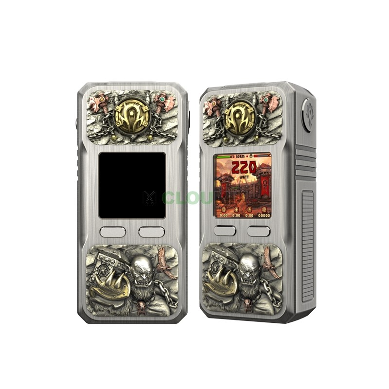 BD Vape Rayden 220 Mod (Limited Edition) is a new box mod applies XT Ultra GT 220 V1.0 Chipset launched by BD Vape. The Rayden 220 boasts dual external 18650 battery with 220w max output and USB-C 5V/2A charging. Comes with 6 output modes: Power (MTL, Soft, Norm, Hard, PRO) and Bypass, the mod can meet your diverse needs. It features a 1.4'' TFT HD screen with 4 available themes that shows the vaping information in real time. Besides, the hand-carved limited-edition nameplate bestow each mod an irreplaceable mark of distinction. The T-REX Limited Edition mod brings the sense of dominance like a prehistoric ruler, and the ORGRIM Limited Edition mod makes you step into the brutal and untamed realn of the Orcs - where raw strength, unyielding honor, and the call of war reign supreme.