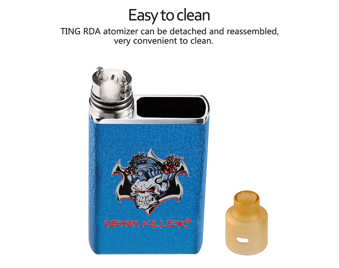 Demon Killer Tiny Kit is a super tiny vape kit coming with a 800mAh mod and a 14mm RDA tank. The mod features a top screen to display the remaining battery. The RDA is easy to build for single coil configuration. And its PEI top cap and side adjustable airflow will provide you with a great vaping enjoyment. The Killer Tiny Kit is available in metal version and resin version.