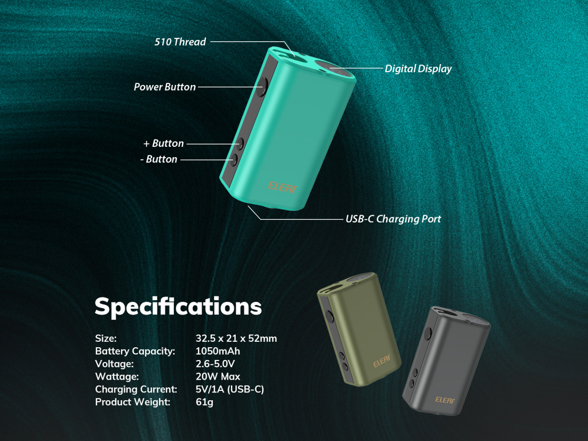 Eleaf Mini iStick 20W Battery is a powerful battery mod launched by Eleaf. Mini iStick is powered by a 1050mAh battery with upgraded USB-C charging and 20W max output, delivering you a worry-free vaping experience. The surface of the device is covered by skin-feel rubberized coating, making it feels solid and comfortable in hand. What's more, the voltage of the device is adjustable from 2.6V-5.0V to make your favourite cloud. Besides, it comes with a digital display, which shows you the voltage setting and battery level.