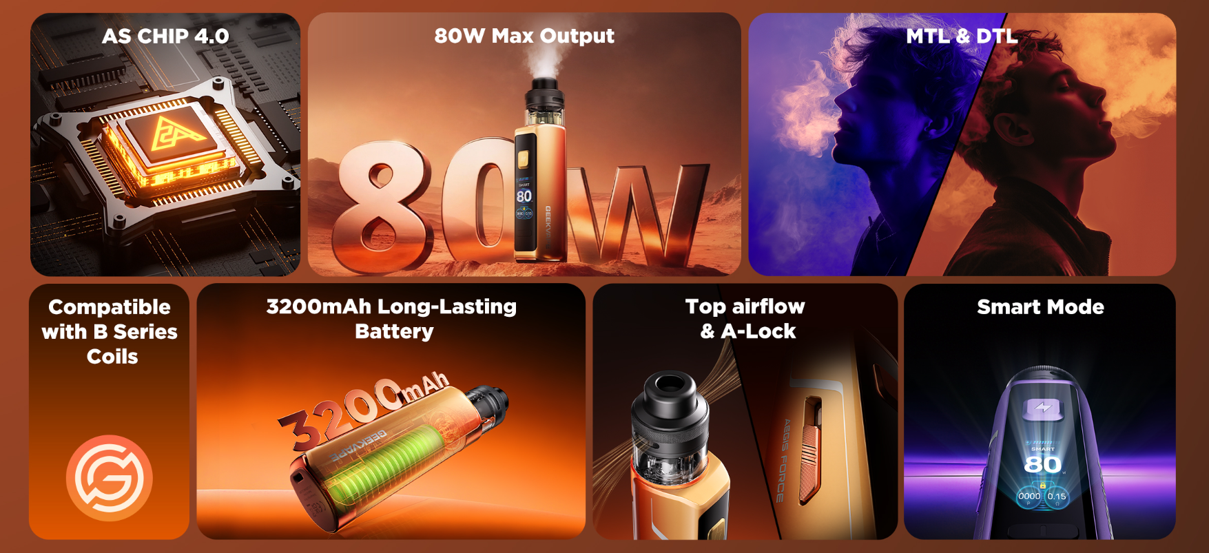 Geekvape Aegis Force Kit is a new kit launched by Geekvape. The Aegis Force is powered by a 3200mAh built-in battery with 80w max output and 5V/2A Type-C charging, which supports a long-lasting vaping. Designed with A-lock physical switch, the kit prevents accidental activation to deliver you a worry-free experience.Meanwhile, the top airflow design keeps the device clean and secure. It also comes with SMART (automatically detect coil resistance and adjust output for optimal performance) & POWER (manual tune and custom vaping style) two modes. Besides, it is compatible with Geekvape B series coil.