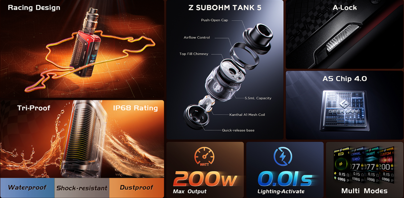 Geekvape Aegis Legend 5 Kit is a new kit launched by Geekvape. The Aegis Legend 5 is powered by dual external 18650 battery with 200W maximum output, which supports a long-time powerful vaping experience. It designed with a 1.08'' ultra screen to show the vaping information in real time. What's more, it features IP68 rating, shock resistant and a-lock design, ensuring a worry-free enjoyment. Besides, the kit comes with multi modes: ECO/SMART/NORMAL/CUSTOM/TC to meet your various vaping needs.