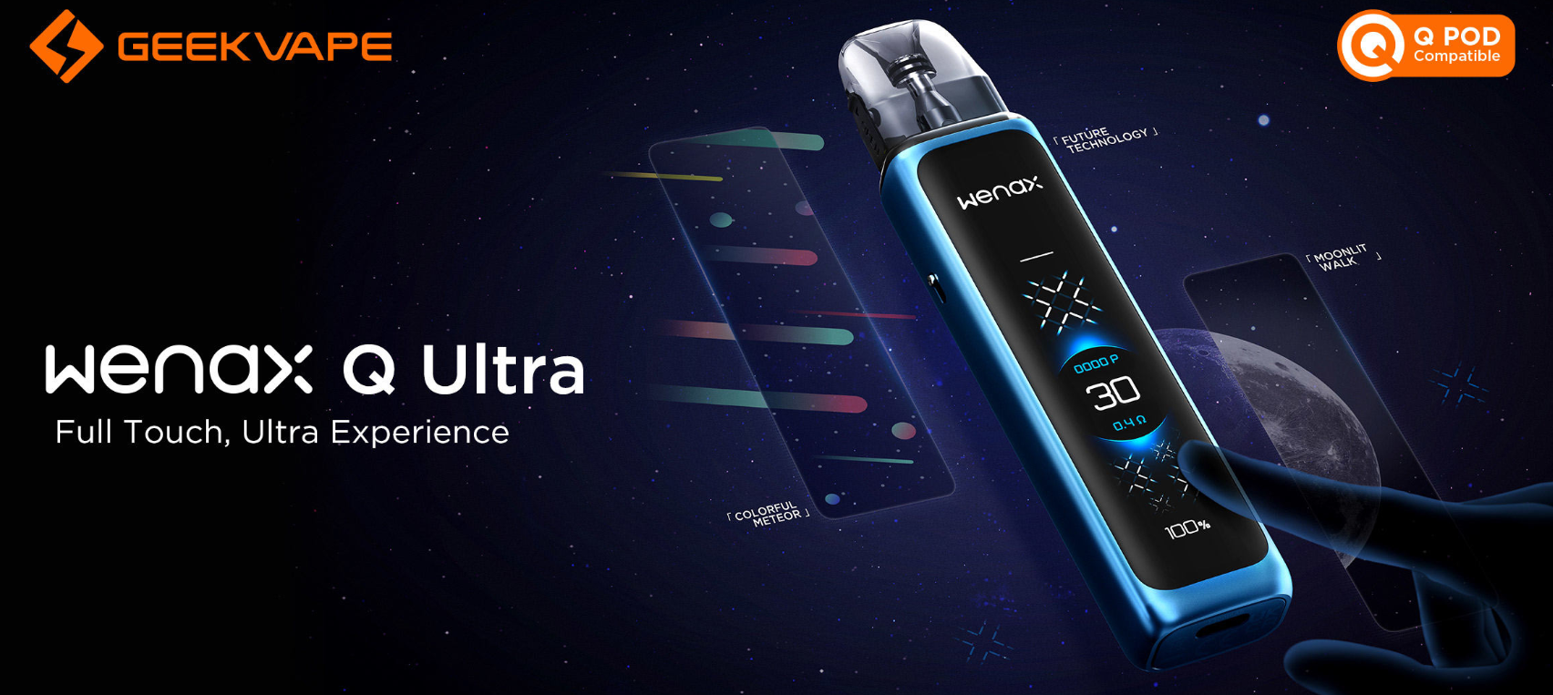 Geekvape Wenax Q Ultra Kit is a full screen pod kit recently launched by Geekvape. The Wenax Q Ultra boasts a built-in 1300mAh battery with 5V/2A Type-C charging and 30W maximum output power. Designed with metallic texture, it features a elegant appearance and perfect hand feel. What's more, it comes with a 2.51-inch full-sized touch screen, which is convenient to monitor the status of the device. The kit also has 3 types of dynamic UI for vaping fun. In addition, it is compatible with the Q cartridge to bring you superior vaping experience.