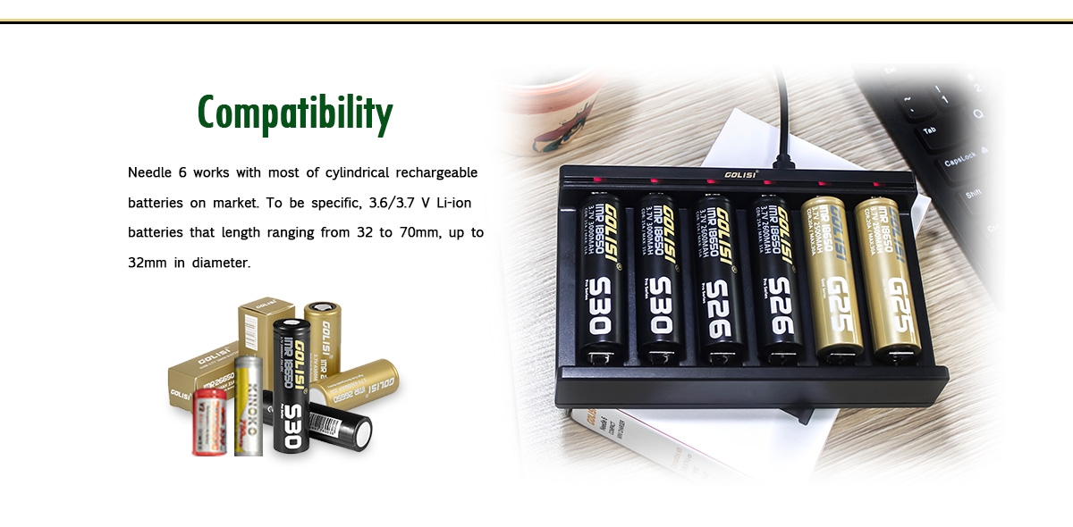 Golisi Needle 6 Charger is a great smart charger with compact and portable palm size and six battery slots. Made of high-quality fire proof resistance materials, the Golisi Needle 6 is very safe to use. And it also has military-grade quality loading spring and contact plates, which lessen interaction resistance and increase smoother sliding action when inserting and removing batteries. The Needle 6 is also highly compactible with most cylindrical rechargeable batteries of length ranging from 32-70mm, up to 32mm in diameter. One more feature of the Golisi Needle 6 is that it detects and regulates its internal temperature in real time. Thus preventing possibility of overheating and over charging. And when Needle 6 detect the batteries are fully charged, it will stop working.
