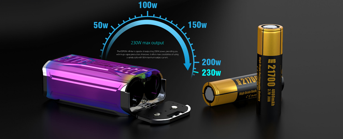 Joyetech ESPION Infinite with ProCore Conquer Kit boasts an intuitive 0.96 inch color display that gives you an easy operation. Powered by dual 21700/ 18650 cells, the ESPION Infinite can fire up to 230W. It can be completely recharged quickly with 2A maximum charging current. Working with the new ProC series heads, the ProCore Conquer provides you optimal and clouds. By using the bulging glass tube, the capacity can be upgraded to 5.5ml. Besides, having the push-to-open system, it is easy to refilling without leaking.