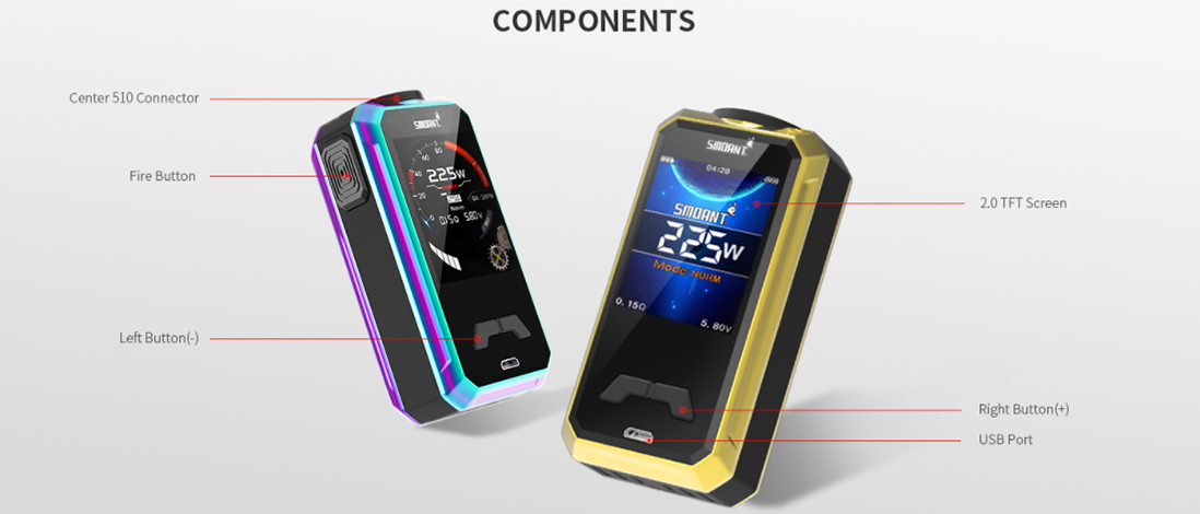 Smoant Charon Mini Mod has a maximum output power of 225W utilizing dual 18650 batteries. Equipped with a 2.0 inch TFT colorful screen with double UI, it is easy to operate. The Charon Mini utilizes the Ant225 chip that supports firmware updating, and its firing speed is only 0.015 seconds. Coming with a Wattage/Temperature curve mode, you will enjoy a customized vaping experience. The box mod provides multiple protections to avoid potential risks. Moreover, the Smoant Charon Mini 225W Box Mod supports balanced charging safety, providing for a safe vaping experience.