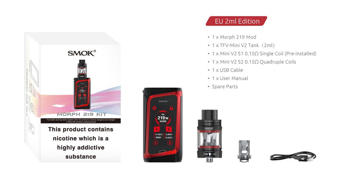 SMOK Morph Kit TPD is a Classic & Modern box mod kit consisting of Morph 219 Mod and 2ml TFV Mini V2 Tank, which collocates various technological advances in high-power vaping system. Powered by dual high amp 18650 batteries (Sold Separately), it integrates an intelligent IQ-S Chipset, shortening firing time to 0.001S. Besides, it can fire up to 219W max output with accurate temperature control and preheat wattage modes. Morph Kit features an ergonomic chassis with large 1.9 inch HD Touch Screen and beautiful resin panel in the back for an overall stunning looking and easy operation. The iconic big lateral fire key and lock button for easy firing operation. As for the atomizer, it comes with a 2ml capacity with bulb Pyrex glass tube, rotary top filling system and dual adjustable bottom airflow control. It adopts Mini V2 S1 0.15Q Single Coil & Mini V2 S2 0.15Q Quadruple Coil and antibacterial medical cotton for purest and massive clouds.