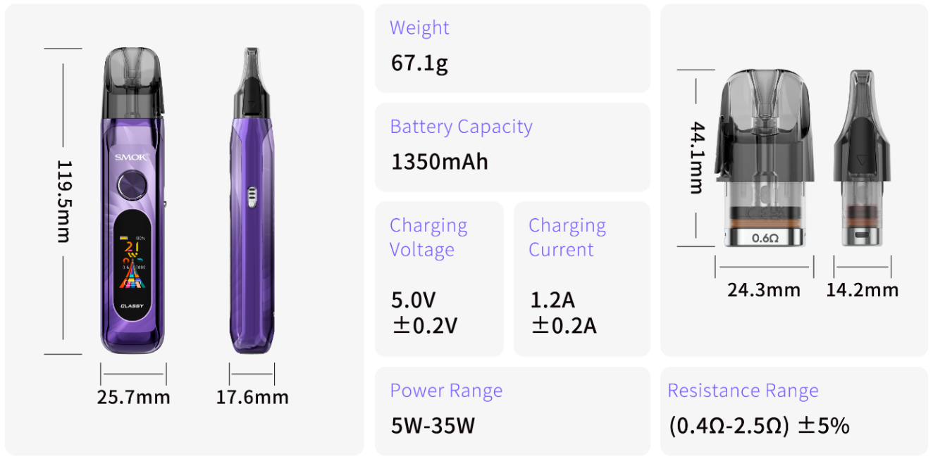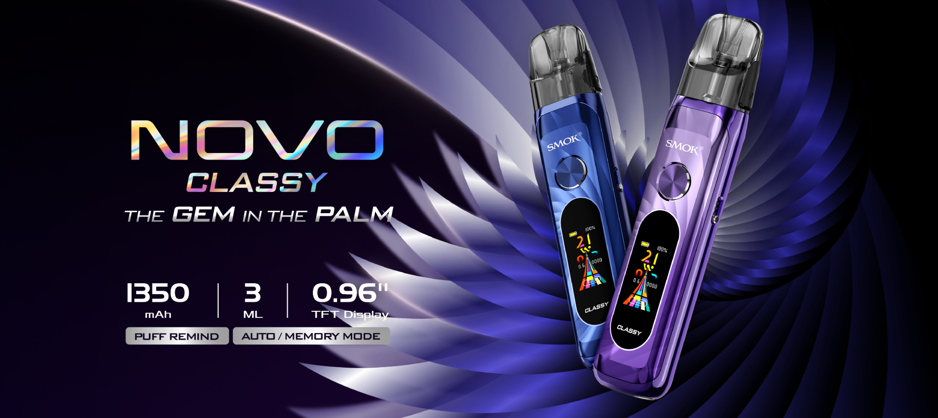 Smok NOVO CLASSY Kit is a compact yet powerful kit launched by Smok. The NOVO CLASSY is powered by a 1350mAh built-in battery with 35W max output power, ensuring an extended vaping experience. What's more, it features a 0.96'' TFT display with 6 themes, which shows the power, battery level and more vaping information in perfect view. Plus, the kit comes with puff remind function that offers a smart and personalized vaping experience by presetting daily usage threshold. Besides, it is equipped with the brand new NOVO Pod (CLX).