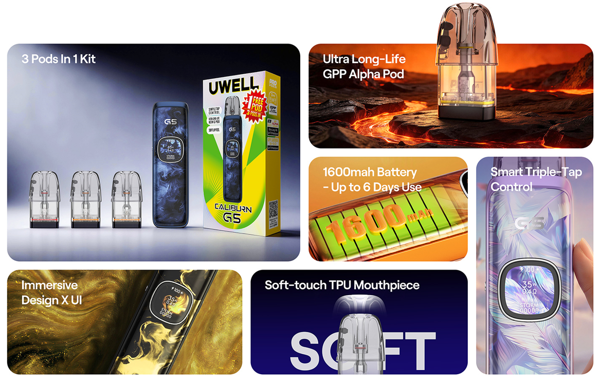 Uwell Caliburn G5 Kit is a new pod kit launched by Uwell, which equipped with 3 pods including the brand new ultra long-life GPP Alpha Cartridge. Crafted from premium aluminum with a refined matte surface, the kit delivers a sophisticated look and an exceptionally smooth, comfortable grip. The Caliburn G5 is powered by a 1600mAh long-lasting battery with 35w max output and 5V/2A Type-C fast charging, which supports up to 6 days of typical use. What's more, it designed with 0.85" HD screen and Integrated Design x Ul for premium clarity and immersive experience. Plus, the triple-tap switch allows you to switch output modes, Ul or brightness instantly. Besides, it is equipped with Caliburn GPP Cartridge and Caliburn GPP Alpha Cartridge, featuring the ergonomic soft-touch TPU mouthpiece.