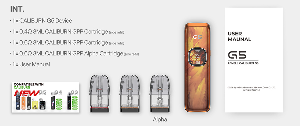 Cartridges in the Box: 0.4Ω 3ml Caliburn GPP Cartridge (side refill), 0.6Ω 3ml Caliburn GPP Cartridge (side refill), 0.4Ω 3ml Caliburn GPP Alpha Cartridge (side refill)