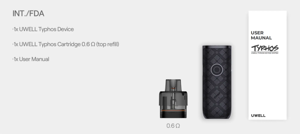 Cartridges: UWELL Typhos Cartridge 0.6Ω (in the box), 0.3Ω (sold separately), 0.8Ω (sold separately)