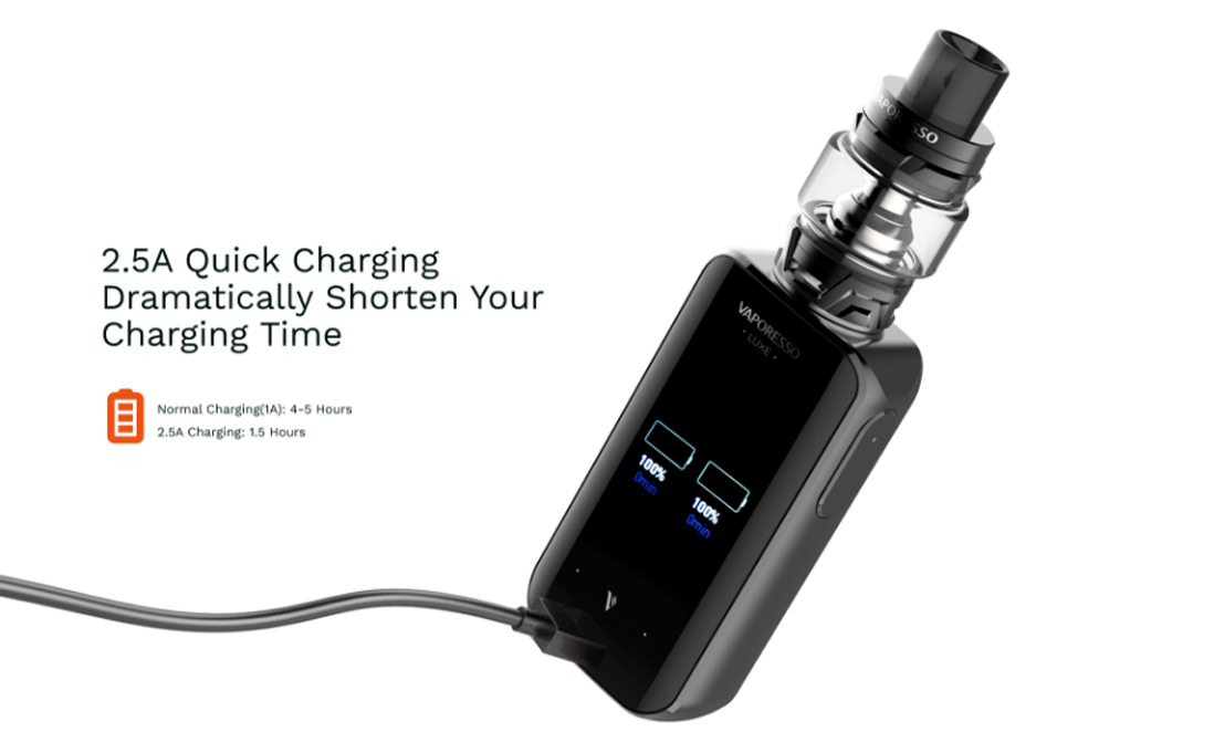 Vaporesso LUXE Kit comes with 220W mod and 8ml SKRR tank. The LUXE mod is powered by dual 18650 batteries and OMNI-Board 4.0 chip. With the 2.5A ultrafast charge technology, it takes only 1.5 hours to fully charge. It features 2.0 inch full-view TFT screen with touch panel and optimized UI interface, which provides you with easier operation. The Insta-fire technology delivers 0.001s firing rate. Paired with SKRR tank, that is designed with top filling system and child-proof lock mechanism. It boots an innovative QF air distribution system that can eliminate cold air intake and create bigger clouds. The QF Coil features bullet-shaped inner structure, no more spit back. And its flax fiber with cotton provides longer lifespan and great .