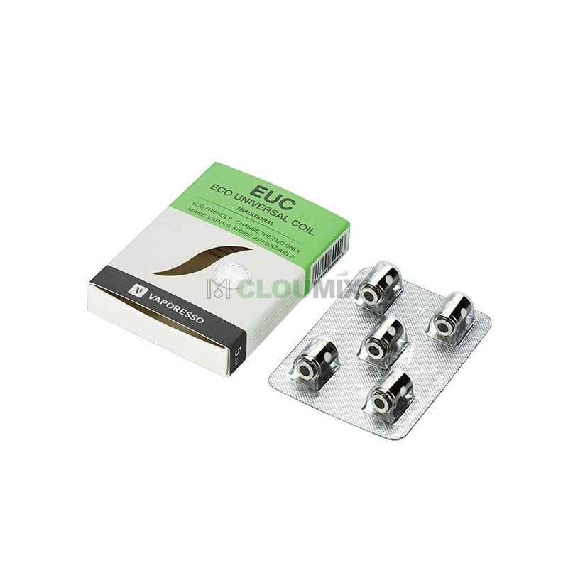 Vaporesso Traditional EUC (ECO Universal coil) Clapton Core Coil Head is design for Estoc Tank Mega/ Estoc/ Doubloon Tank, but also can apply for Target Pro/ ORC/ Gemini/ Aspire Atlantis/ Eleaf Pico/ Eleaf iJust Tank (need an extra sleeve). It features 0.4ohm resistance with 10-50W and 0.5ohm resistance with 35-40W, delivering cloud-size vapor with the purest . The EUC allows you to replace only the core of your atomizer which is called EUC by dropping it in and out of its casing, leaving the metal sleeve. 5pcs each pack.