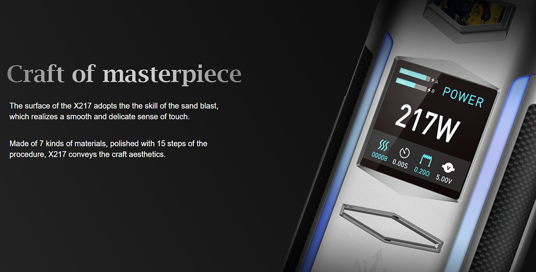 VOOPOO & Woody Vapes X217 TC Box Mod is newly designed including traits of elegance, craftsmanship, and quality. Compatible with dual 21700/20700/18650 batteries, it can fire up with the max output of 217W. With a “V” shape of colorful breathing LED light, it contains 4 modes including Power/Voltage/Temperature Control/Custom Mode for different vaping modes. It is installed with 32 bits of high-end geek customized chip for the fastest speed of ignition which can reach to only 0.01 second, made of 7 different kinds of materials and polished with 15 steps of the procedure X217 conveys the craft aesthetics. And adopting the skill of the sandblast can form a smooth and exquisite sense of touch. What's more, utilizes 8 Battery Charging Protections for Safer Internal Charging System.